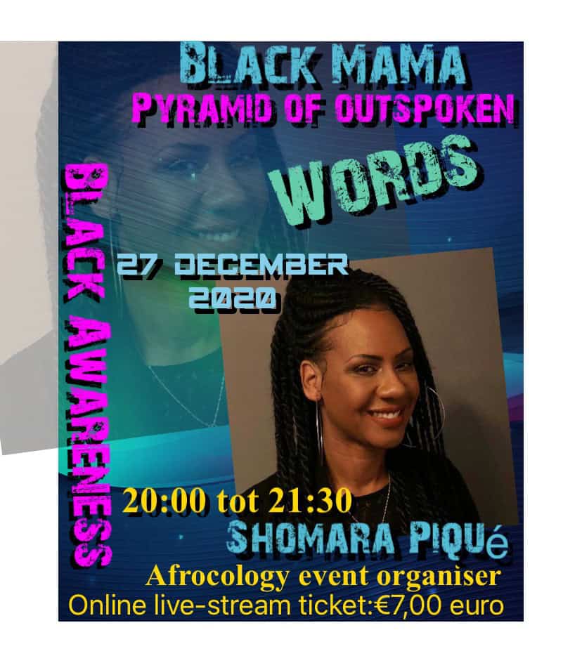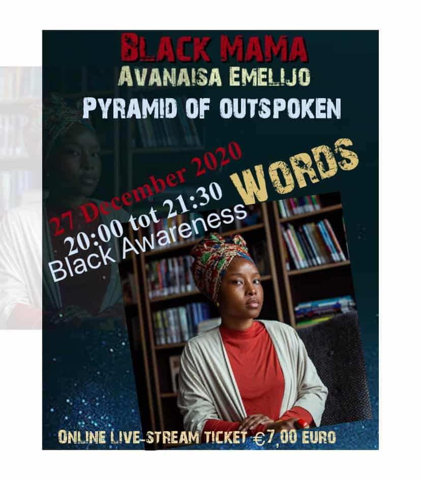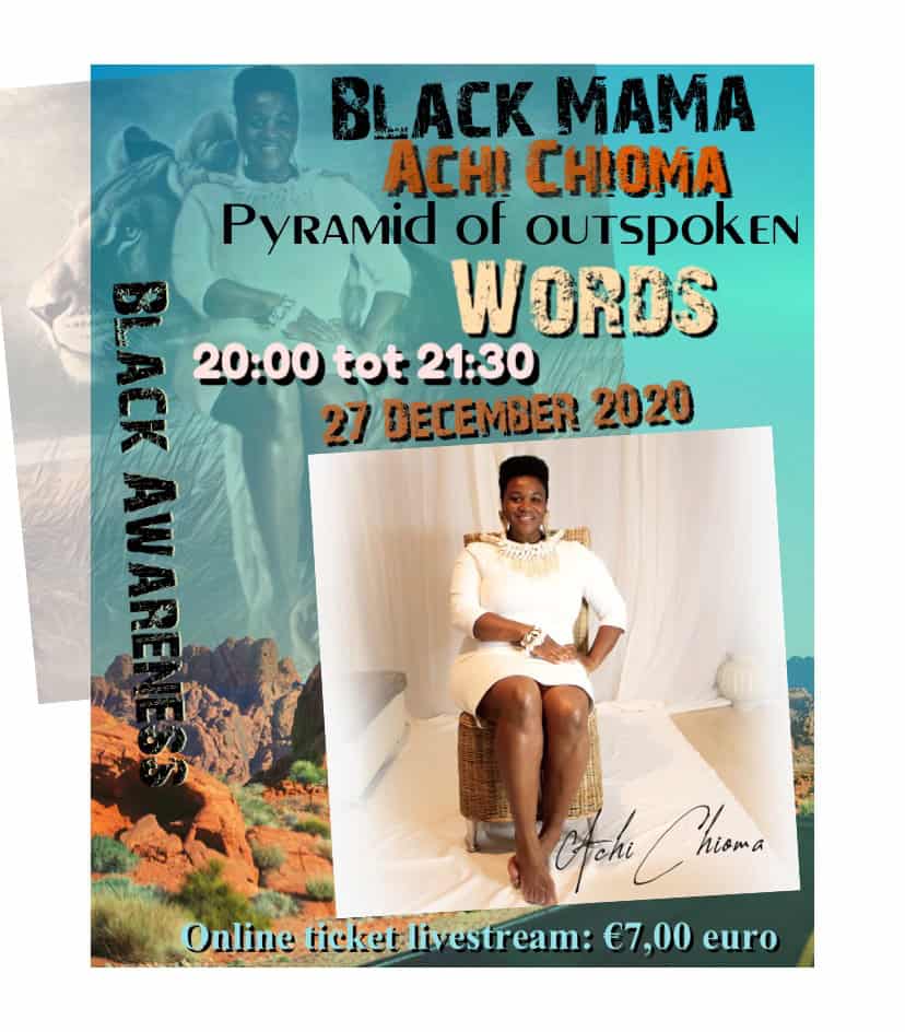 Zeven Spoken Word kunstenaars schitteren op 27 december tijdens de “Black MaMa Pyramid of outspoken words” dat Achi Chioma houdt in samenwerking met Afrocology event planner. “Dit is geen algemeen Spokenword event maar echt gericht naar de black community voor heling, groei, ontwikkeling en om awareness te brengen onder ons en over de black community,” vertelt Achi.