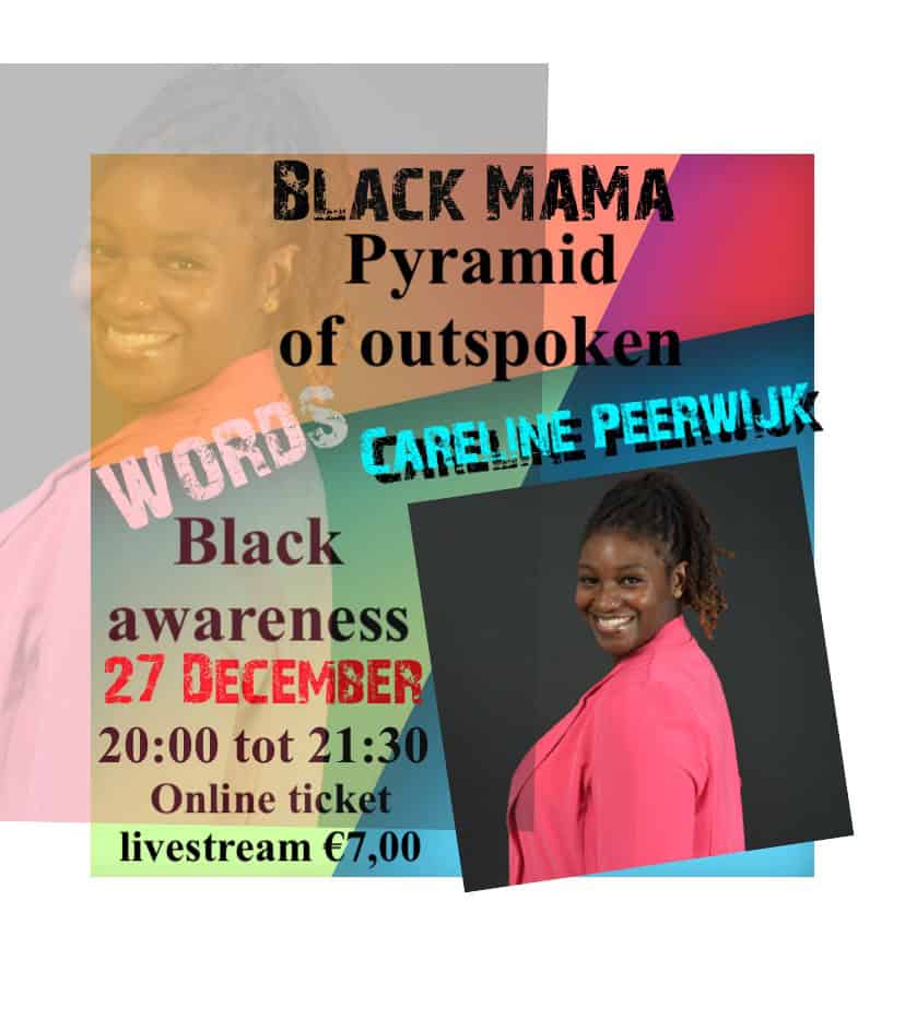 Ze vertelt over het online event: “Zeven zwarte vrouwen zullen op deze wijze hun stem laten gelden in een turbulente tijd waarin de stem van de zwarte vrouw gedempt wordt. Op deze live Black Awareness Piramid laten zij in ieder geval hun mond niet snoeren. Ze kappen er namelijk mee!”