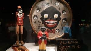 Naast de tentoonstelling over de Negro Renaissance -de periode rond het begin van de 20-ste eeuw, toen zwarte mensen de marginalisatie ontvluchtten naar de grote steden en daar een nieuwe bruisende zwarte cultuur ontwikkelden-, staat een kast vol beeldjes, foto’s en affiches uit dezelfde periode waarin ze belachelijk werden uitgebeeld door minstrels, zwart geschminkte witte acteurs, met geaccentueerde dikke rode lippen.