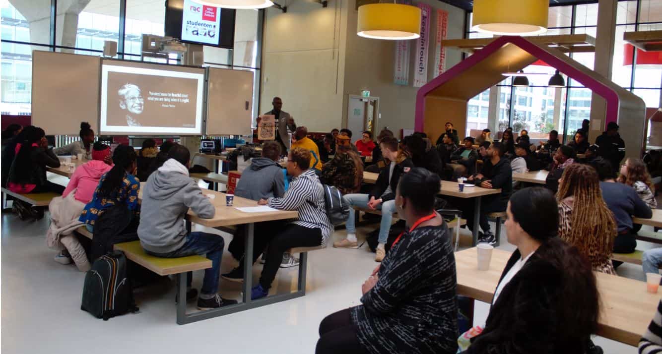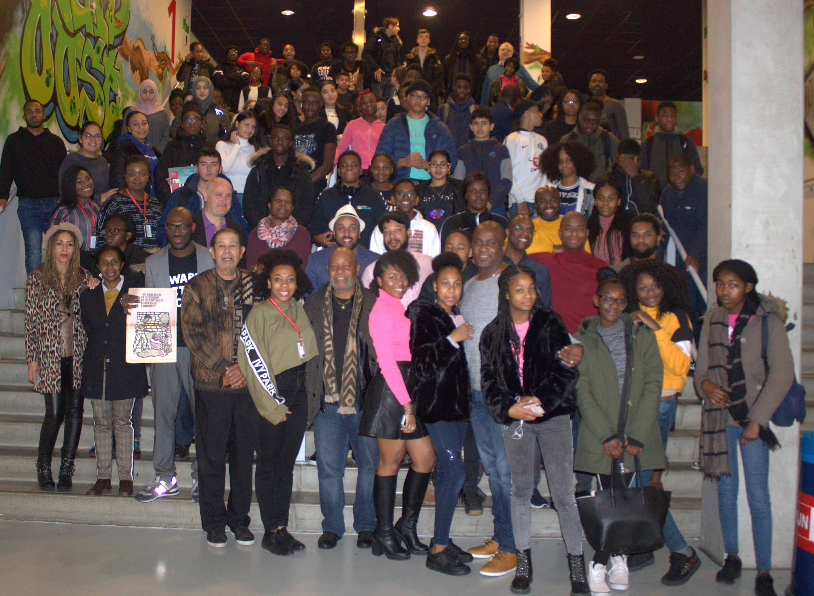 Activist Mitchell Esajas die samen met Jerry Afriyie enkele weken geleden de rechtzaak won tegen de blokkeerfriezen, gaf een korte presentatie over het ontstaan van zwarte Piet en waarom hijj zich ertegen verzet. "Er zijn mensen die zwarte Piet genoemd worden vanwege hun huidskleur. IK heb het nooit meegemaakt, maar mijn moeder wel. Neven van me. Vrienden van me. Ik wil in een land wonen waar onze kinderen dat niet meer hoeven mee te maken," vertelde hij de zaal die aan zijn lippen hing. "Ik hoop dit in de toekomst niet meer te hoeven doen; maar naar hier te kunnen komen met deze rolmodellen om onze jongeren te laten zien wat kan."