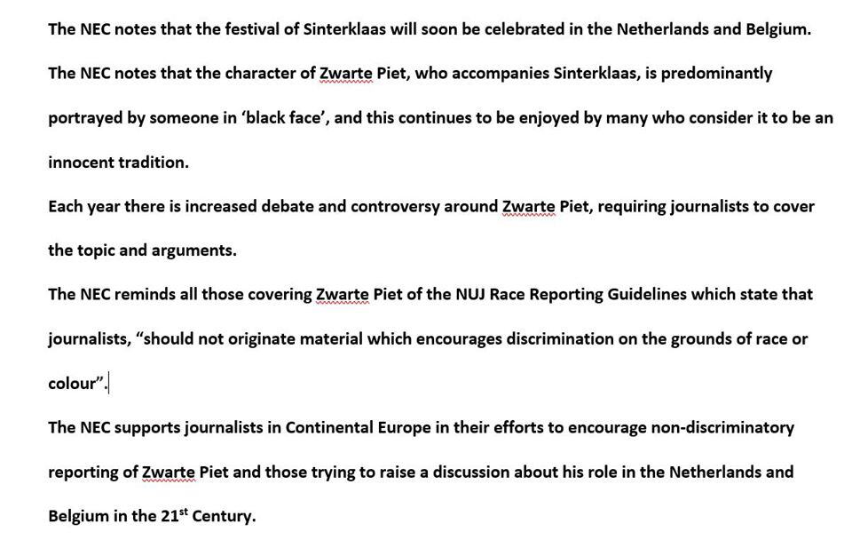 “De NEC ondersteunt journalisten in Europa die zich inzetten voor discriminatie-loze verslaggeving van zwarte Piet en ook zij die proberen een discussie op gang te brengen over zijn rol in Nederland en Belgie in de 21-ste eeuw,” staat in de motie.