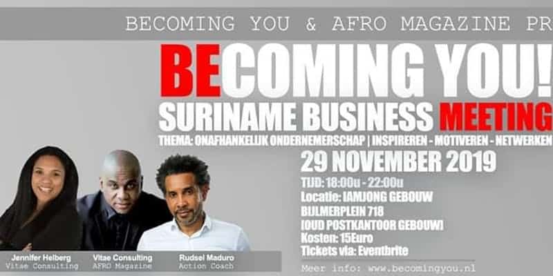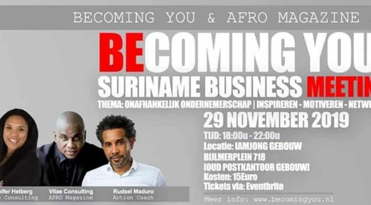 BECOMING YOU en AFRO Magazine organiseren i.v.m. onafhankelijkheidsdag van Suriname de Suriname Businnes Meeting, een event waarbij succesvolle ondernemers en ervaren professionals uit de Surinaamse, Caribische en Afrikaanse diaspora hun kennis en ervaring zullen delen. Tijdens dit event zullen Marvin Hokstam (AFRO Magazine), Jennifer Helberg( Vitae Consulting) , Rudsel Maduro ( ActionCOACH) en Clarence Creebsburg (Becoming You) spreken.