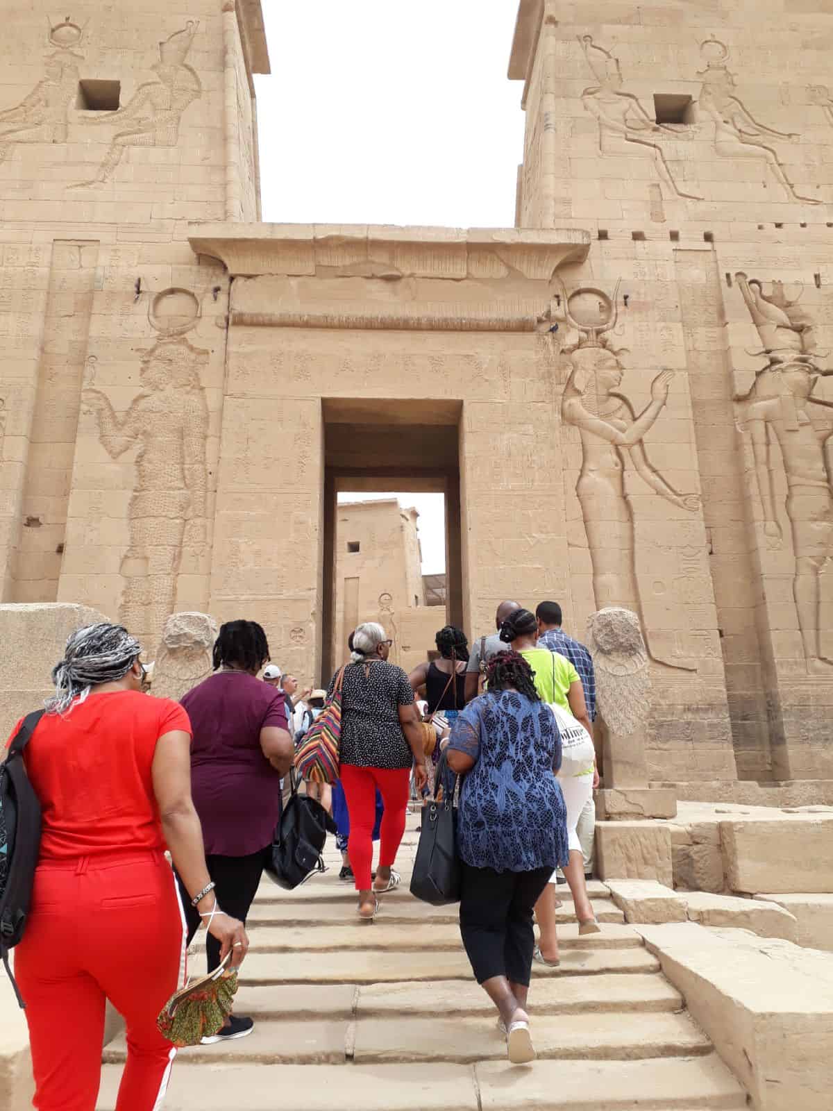 De tempel van Auset. De tempel heeft veel te verduren gehad onder de vershillende overheersers van het gebied; het originele bouwwerk is uiteindelijk in het verleden samen met de omliggende dorpen en haar bewoners onderwater gebracht. Wat we bezochten is een replica die onder andere door Unesco gebouwd is.
