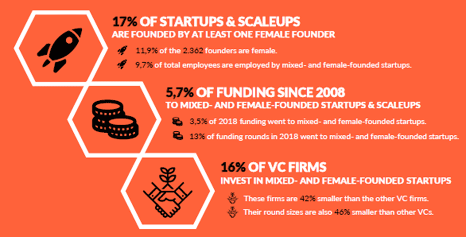 Niessen zegt dat er in 2018 meer dan 580 miljoen Amerikaanse dollar is geïnvesteerd door Venture Capital in Nederland. “We hebben gezien dat van alle investeringen sinds 2008, maar 5.7 procent geïnvesteerd was in teams die geleid werden door een vrouw. Op wereldschaal loopt Nederland achter; van alle teams in Nederland waarin werd geïnvesteerd bestond maar 0.8 procent uit vrouwen en 4.9 procent was gemixt.