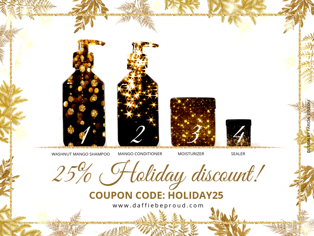 De kou in december is funest voor mensen vanaf type 3 haar, maar daar hebben Farida en Daphne wat op: de AfroGold leave-in conditioner en de hele lijn van Daffie Be Proud zijn afgeprijsd deze feestdagen! Met maar liefst 25% korting in de webshop! Koop ze helemaal leeg!