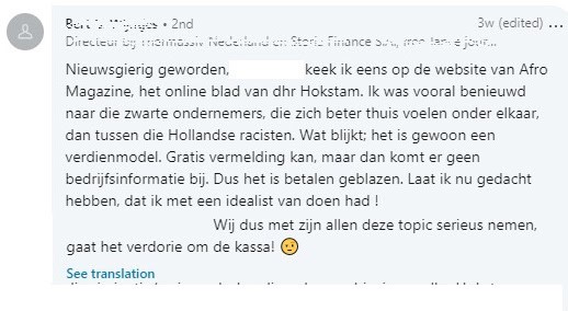 Het meest frappante was de dude in de bijgaande foto. Die ging naar AFRO Magazine en zag hier dat ik op de Black Owned Business pagina zwarte ondernemers geld reken voor hun promotie.