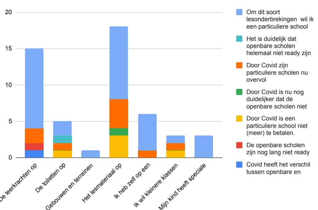 35.3% vindt lesmateriaal verouderd; 29.4% vindt dat leerkrachten te vaak staken; 11.8% zat als kind zelf op een particuliere school; 9.8% vindt toiletten onhygienisch; van 6% heeft het kind extra zorg nodig; 7.7% is verdeeld over andere redenen.