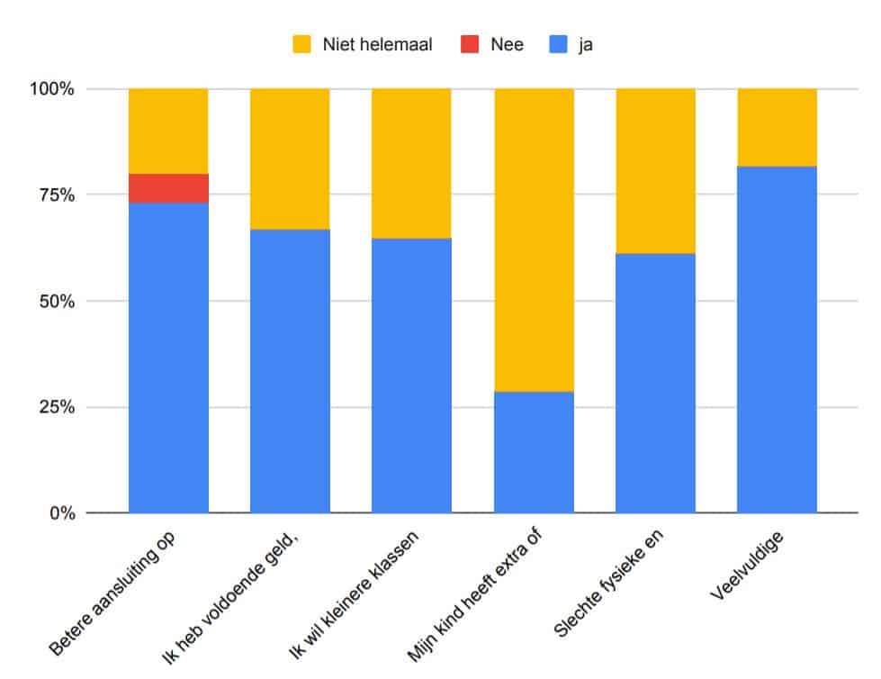26% vindt klassen te groot; 24.7% vindt lesmateriaal verouderd; 20.5% wil aansluiting buitenland; 15.1% vindt dat leerkrachten te vaak staken; van 9.6% heeft het kind extra zorg nodig; 4.1% is verdeeld over andere redenen.