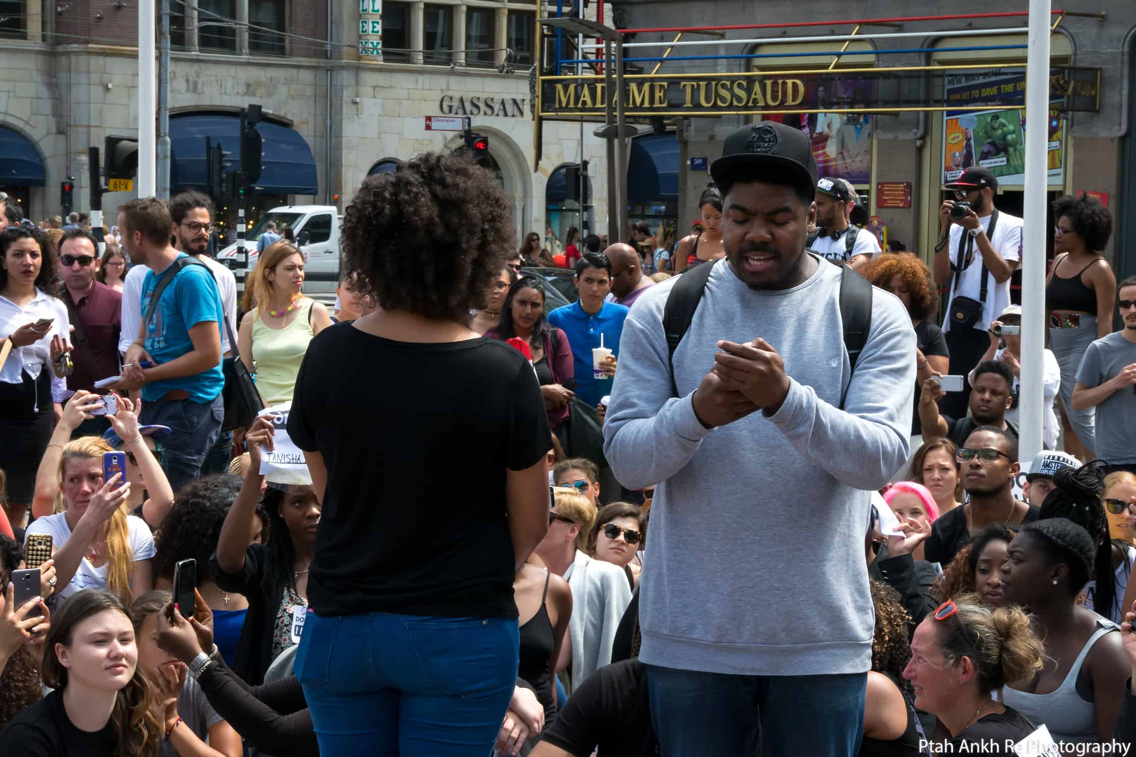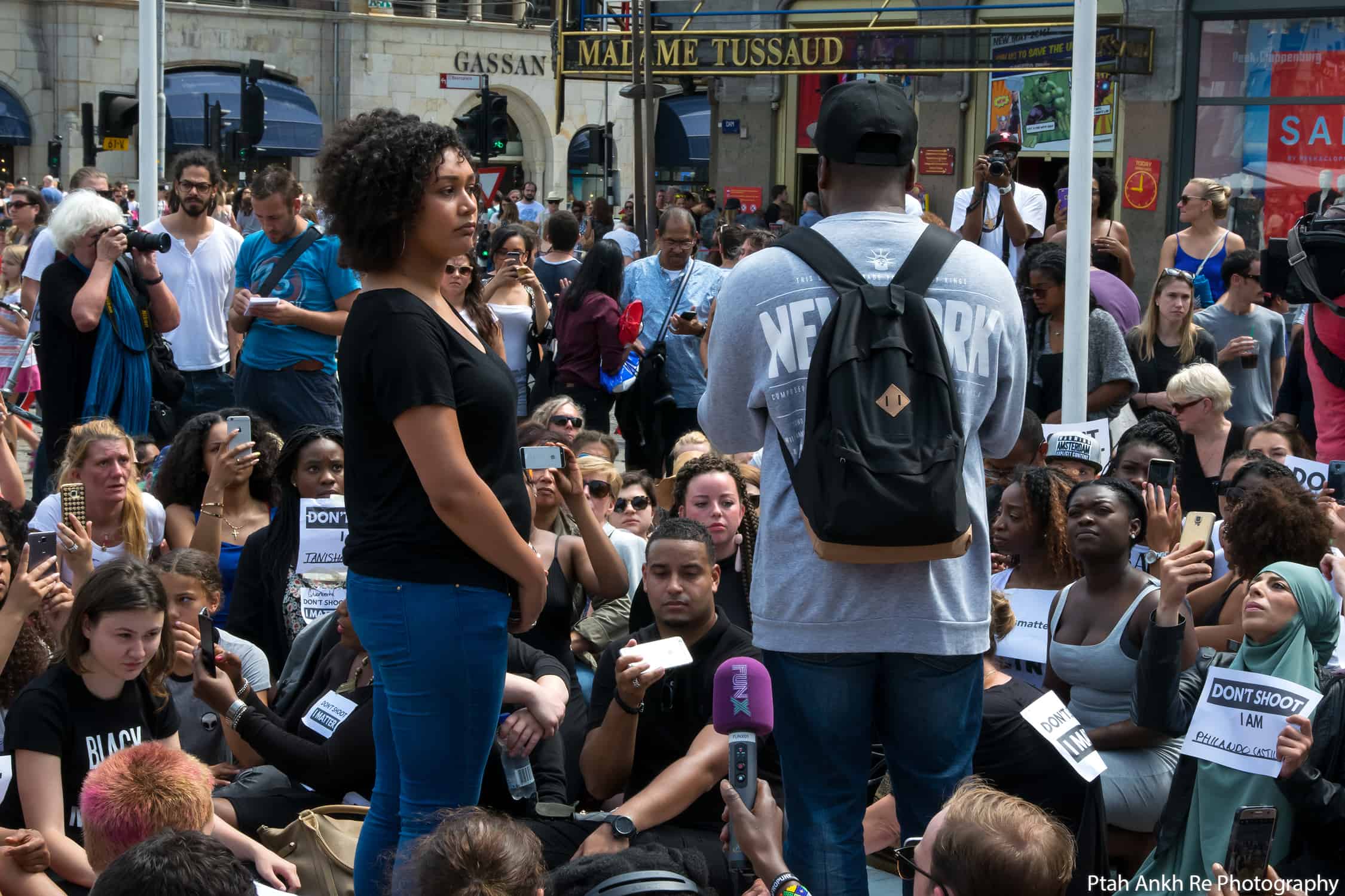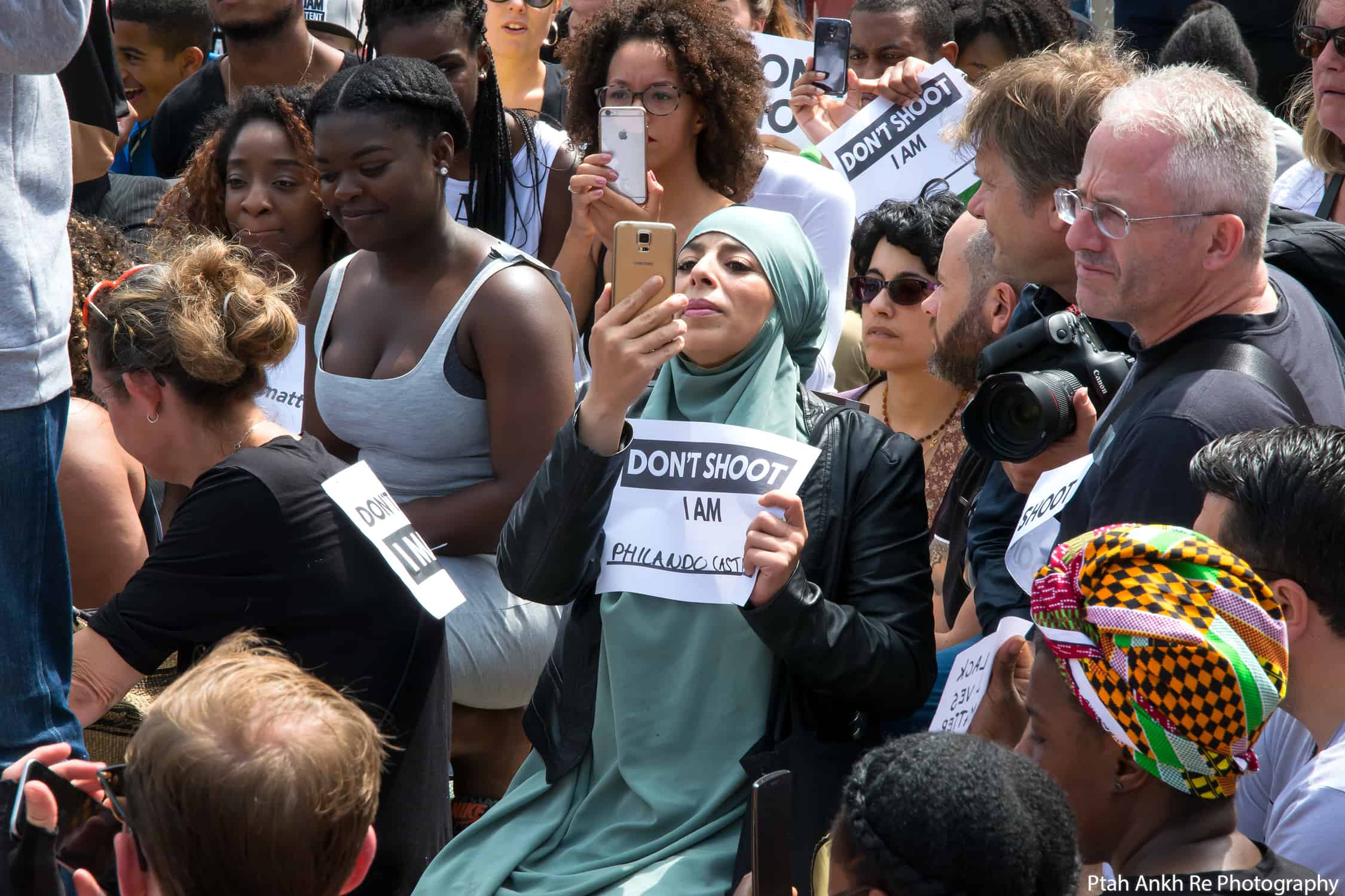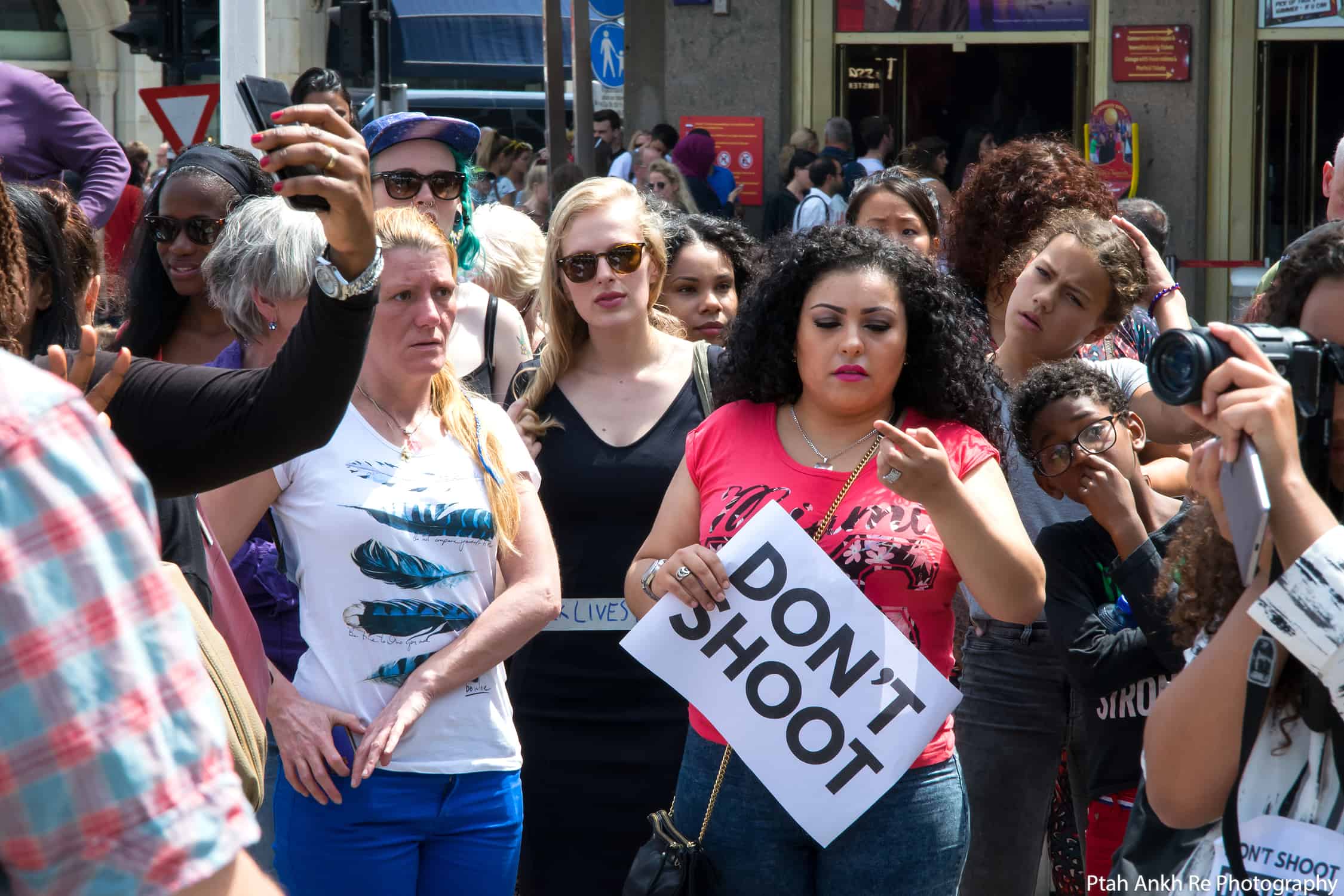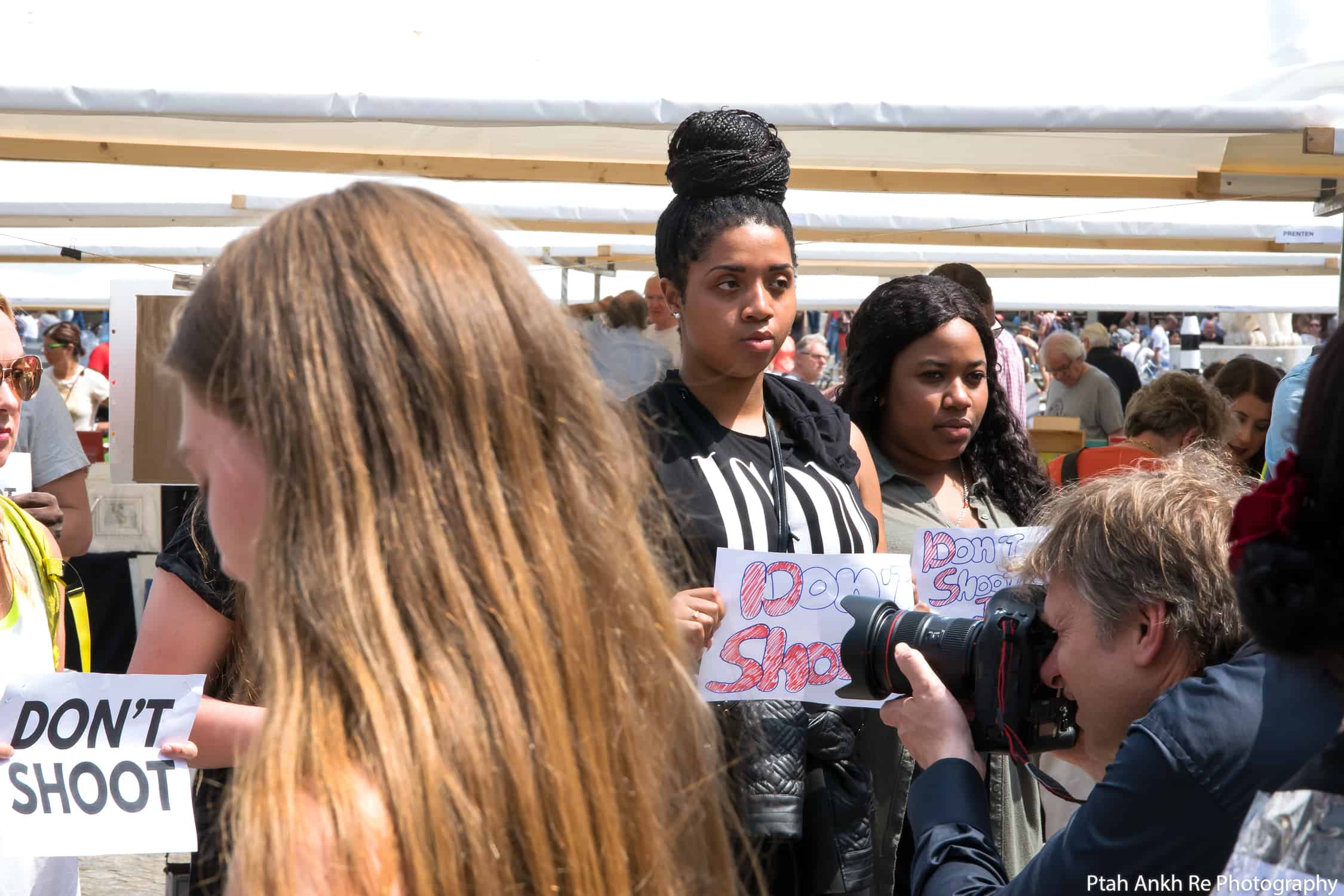 Iedereen had stickers op de rug geplakt met teksten als "Don't shoot", "#Blacklivesmatter" en "Don't shoot, I am...." We stonden eerst in stilte, met de handen omhoog en gilden toen "DON'T SHOOT!"